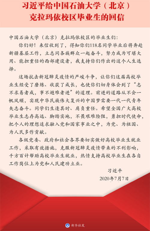 习近平给中国石油大学(北京)克拉玛依校区毕业生的回信