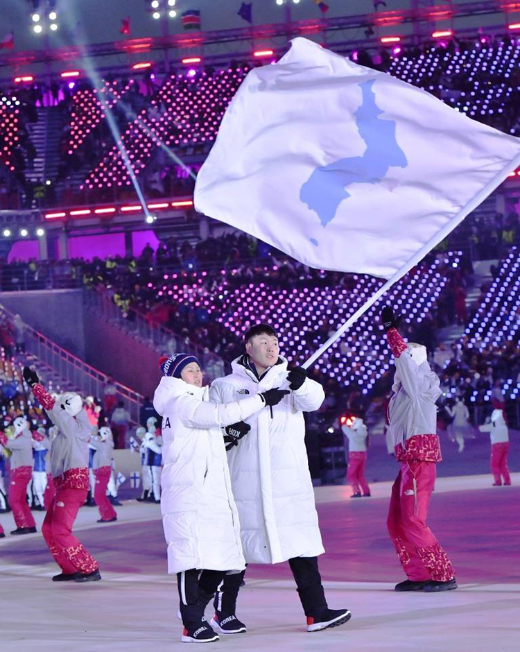 图说:2018年2月9日,朝韩两国代表团旗手黄忠琴(左)与元允宗在开幕式上举“朝鲜半岛旗”共同入场