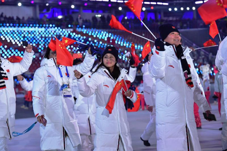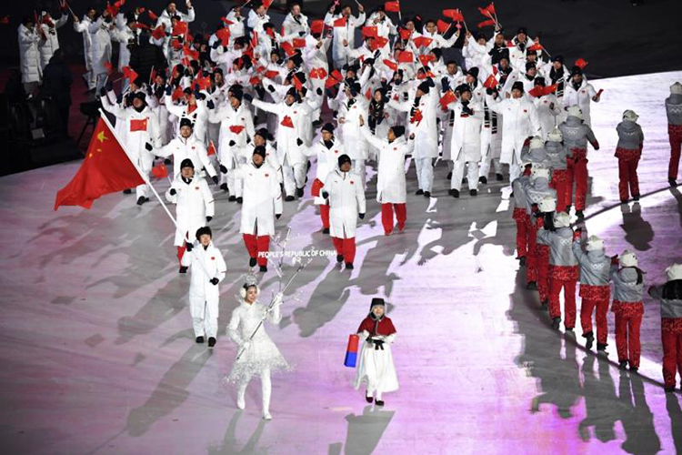图说: 2月9日,中国代表团成员在开幕式上入场