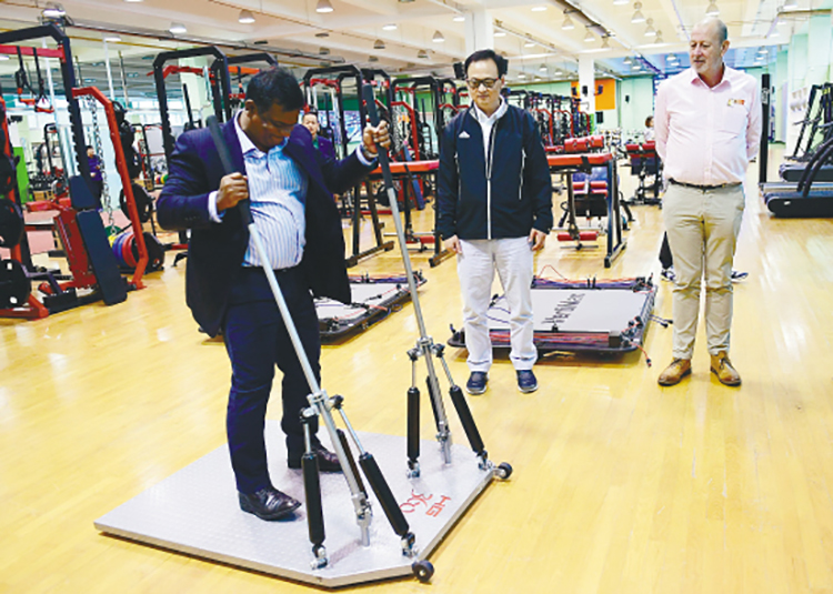 在沈阳体院体能训练中心,国际板球联合会亚洲区发展经理阿米努(左一),亲身体验世界先进体能训练器材。张文魁摄