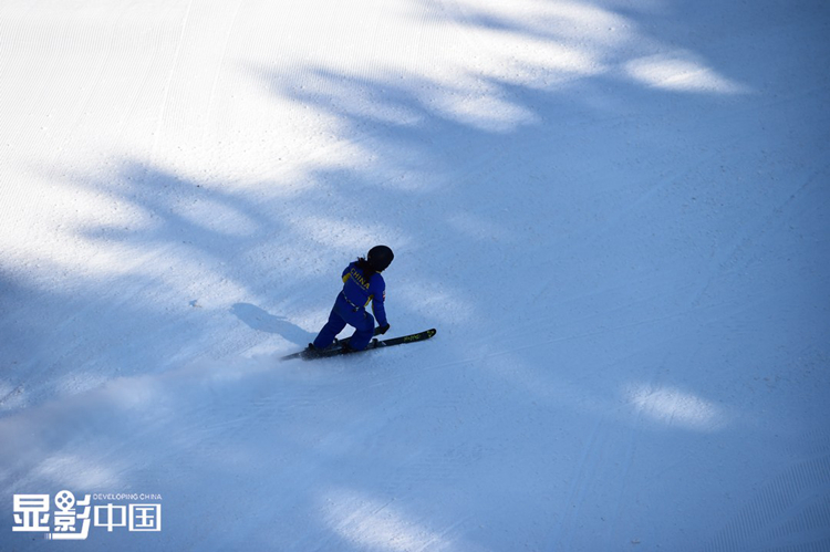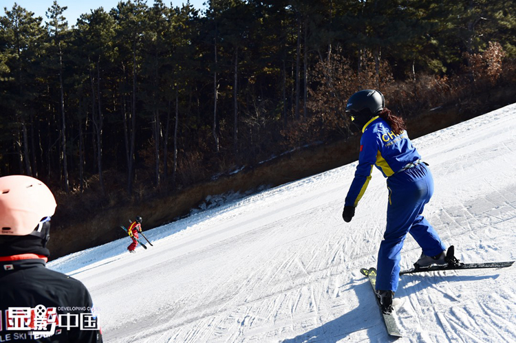 白清寨滑雪场,郭心心教练正在指导运动员王升彦竹进行训练。图为王升彦竹在训练中。新华网 姜冰摄
