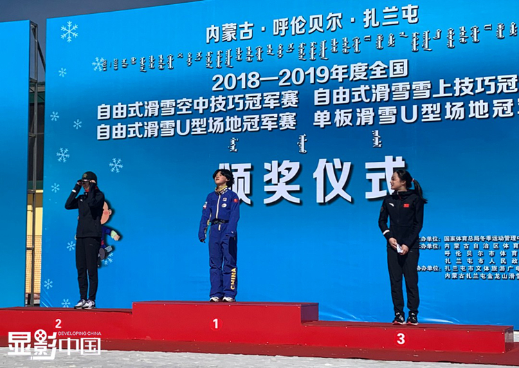 凭借多年来的努力,王升彦竹曾获2018-2019年度全国自由式滑雪空中技巧青年女子组滑行技术比赛冠军,2019-2020全国自由式滑雪空中技巧锦标赛团体第三名等多项优异成绩。图为王升彦竹(中)在2018-2019年度全国自由式滑雪空中技巧青年女子组滑行技术比赛颁奖仪式上。(受访者供图)