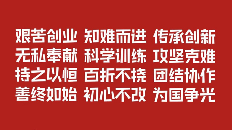 艰苦创业,知难而进,传承创新,无私奉献,科学训练,攻坚克难。