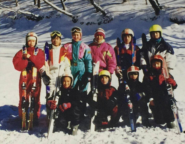 杨尔绮教练(后排左四)带领小运动员冬训留影。后排左二韩晓鹏,前排左一李妮娜,前排右一郭心心。