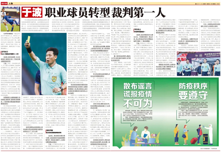 于波:在我做职业球员的时候,我倒没觉得裁判是“天敌”,因为我曾经是队长,所以我必须要做榜样尊重裁判,而且我的职业生涯中没有受过因红黄牌带来的停赛处罚,在2003年,我整个赛季踢了35场比赛,只拿到了3张黄牌,当年联赛我们拿到了第五名,足协杯进入了半决赛,拿到了第三名,全队只有我跟守门员是出场时间最多。作为队长,我尊重判罚结果,但面对裁判的判罚,我也有看不懂的和困惑的。