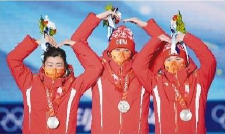 2月11日,徐梦桃、贾宗洋和齐广璞(从左至右)在奖牌颁发仪式上。新华社供片