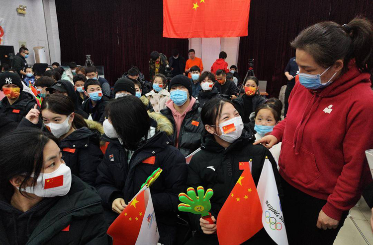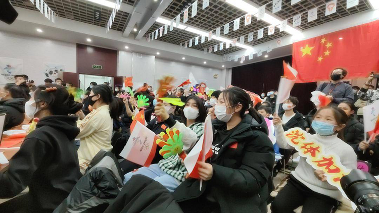 自由式滑雪空中技巧队的小队员挥舞着助威牌,为中国队加油。中国队以预赛第一名成绩跻身决赛,这让大家对决赛更加充满期待。