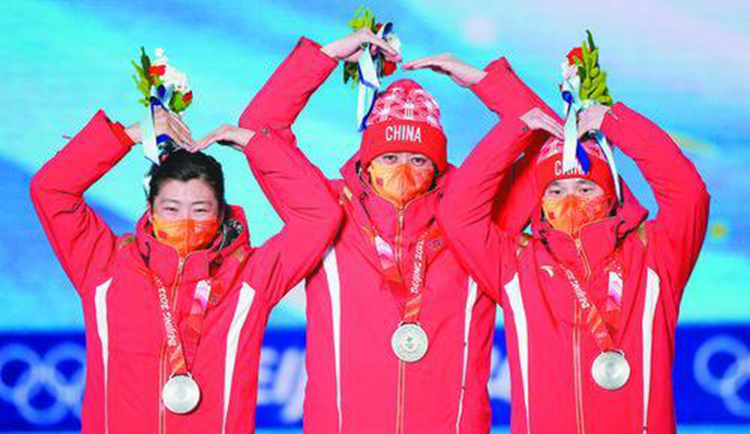 2月11日,徐梦桃、贾宗洋和齐广璞(从左至右)在奖牌颁发仪式上。