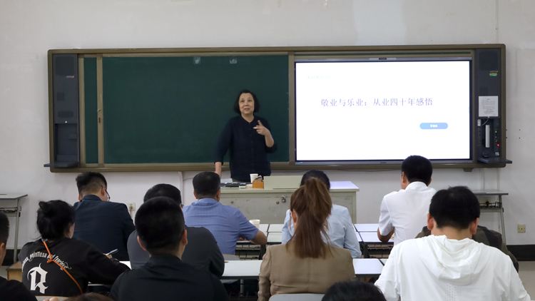 曹继红以《敬业与乐业:从业四十年感悟》为题将社会学理论与自身实际相结合,从工作经验、个人感悟等方面,围绕“新时代”“高素质”“专业化”等关键词,讲述了自己从业四十年如何立足岗位努力践行教育家精神,引领学生追求真理、帮助学生成长成才。她指出,教师是立教之本、兴教之源,要时刻秉持一颗谦逊、好学、求知的心,将教育家精神当作是一种责任、一种担当,成为一名具有成长型思维的教师,坚持立德树人,做高尚师德的传承者;坚持学以致用,做教书育人的示范者;坚持爱岗敬业,做甘于奉献的践行者。