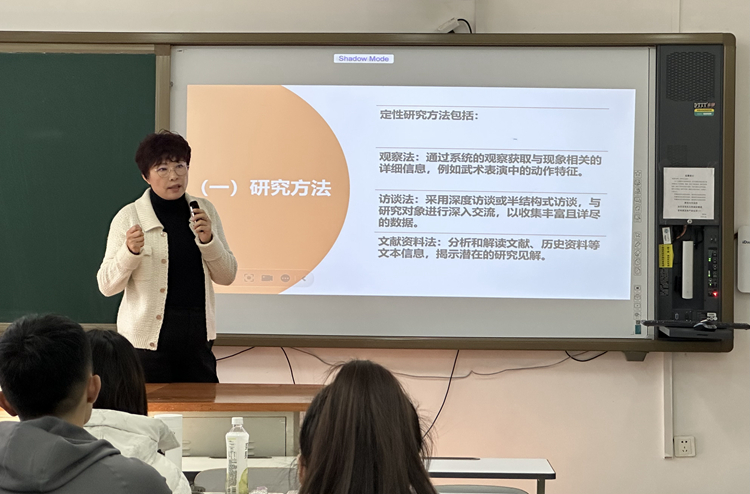 于晶从“近五年研究生论文总结”“研究生论文选题思路”和“研究生论文写作思路”几个方面结合体育运动心理学重点阐述了如何进行论文选题和撰写。此外,她通过形象的语言、鲜明的案例分享了自己近20年的教学经验,结合现场提问互动等多种形式讨论了研究内容、研究对象和样本量的重要性,并对学生提出了研究创新性和逻辑性的建议。