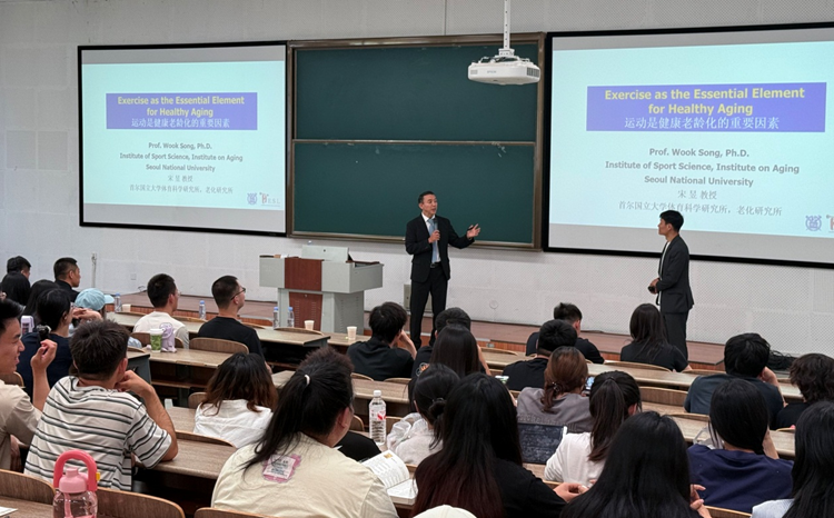6月11日,运动健康学院举办“运动健康大讲堂”,邀请韩国首尔大学宋昱教授作专题讲座,学院300余名师生参加。 宋昱教授结合前沿研究成果,从氧化应激、炎症、端粒、表观遗传等多维度出发,深入解析了运动的四大抗衰机制及其在促进健康老龄化中的科学原理与实践路径,阐述了运动是解码健康老龄化的科学秘钥。 与会师生进一步了解了运动在延缓衰老、预防慢性疾病、提升认知功能等方面的作用,为强化专业知识、深入理解运动对健康老龄化的意义、掌握科学运动方法提供了理论支撑。 新闻作者:运动健康学院 责任编辑:全魁博 新闻日期:2025-06-12 点击:次