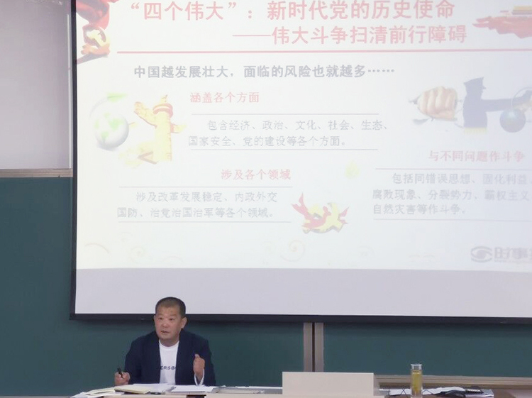 樊占平从“四个伟大”的由来及其相互关系,讲述了新时代要实现伟大梦想,就必须进行伟大斗争、建设伟大工程、推进伟大事业。并着重强调了中国特色社会主义进入新时代的重大意义;细致梳理了中国人民从“站起来”到“富起来”再到“强起来”的历史发展脉络;分析了“四个伟大”的深刻内涵及相互关系。