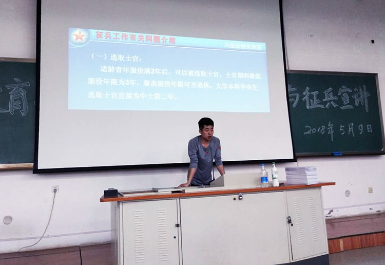 学工部(武装部)干事焦凯宣讲征兵政策 5月9日下午,体育教育学院在教学楼111教室召开毕业生征兵宣传工作,邀请学工部(武装部)干事焦凯进行征兵政策宣讲,体育教育学院总支副书记王晓艳、毕业年级辅导员参加了会议。 焦凯就2018年国家征兵新政策给予解读,包括征兵流程、相关待遇,服役期间和退役之后与学生切身利益相关的政策及注意事项;会上,王晓作了征兵动员工作,鼓励毕业生同学热爱祖国、报效国家,怀揣远大理想,充满激情地投身到新时代国家国防建设中去。 新闻作者:体育教育学院 王彪 责任编辑:朱翠立 新闻日期:2018-05-10 点击:次