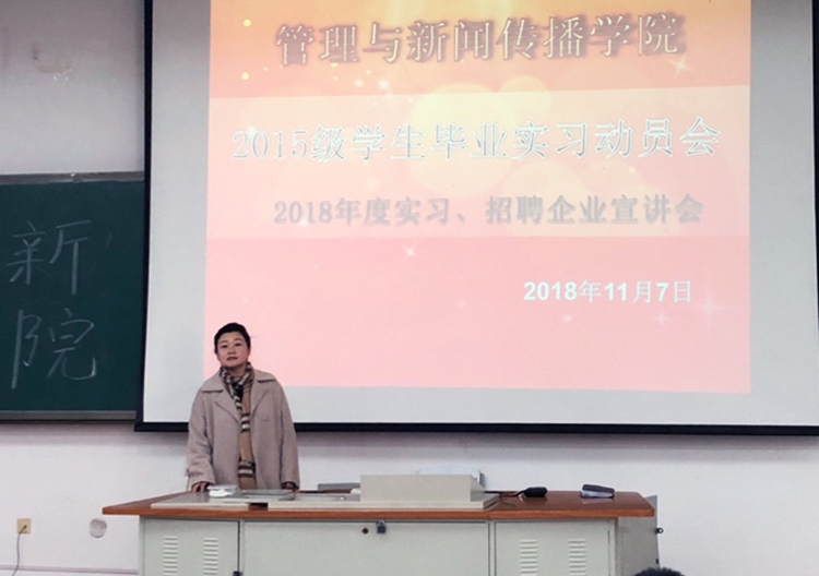 为进一步巩固学生专业理论知识,拓展学生视野,提高学生专业实践能力,11月7日下午,管理与新闻传播学院2015级实习动员大会在教学楼111教室召开,党总支副书记高鸿雁、副院长姚瑶、相关专业教研室支部书记及班导师出席了会议。