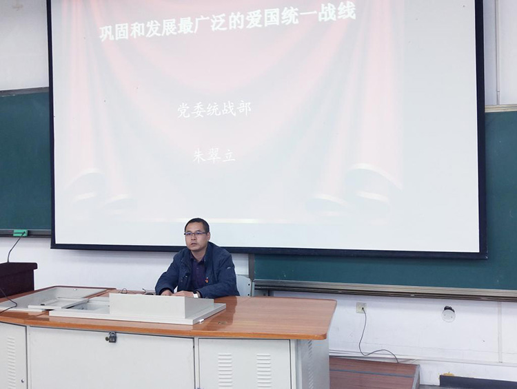 党委宣传部、统战部副部长朱翠立作《巩固和发展最广泛的爱国统一战线》专题讲座,管理与新闻传播学院全体干部教师、学生党员110余人参加了本次讲座,讲座由党总支书记张建波主持。