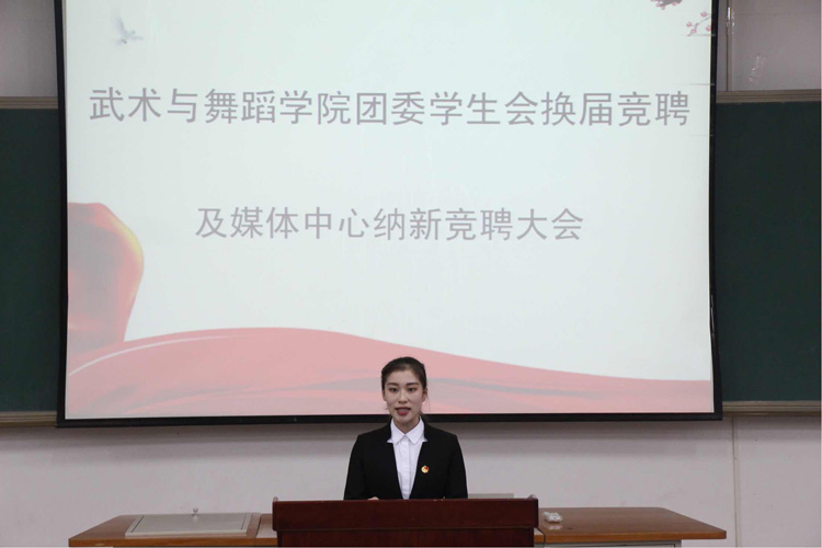 为积极响应团中央《高校共青团改革实施方案》的号召,落实校团委相关文件要求,进一步提高武术与舞蹈学院学生干部的能力水平,引导学生干部更好地为广大同学服务,12月16日晚,武术与舞蹈学院团委在教学楼举行第三届团委学生会换届竞聘及媒体中心纳新竞聘大会。
