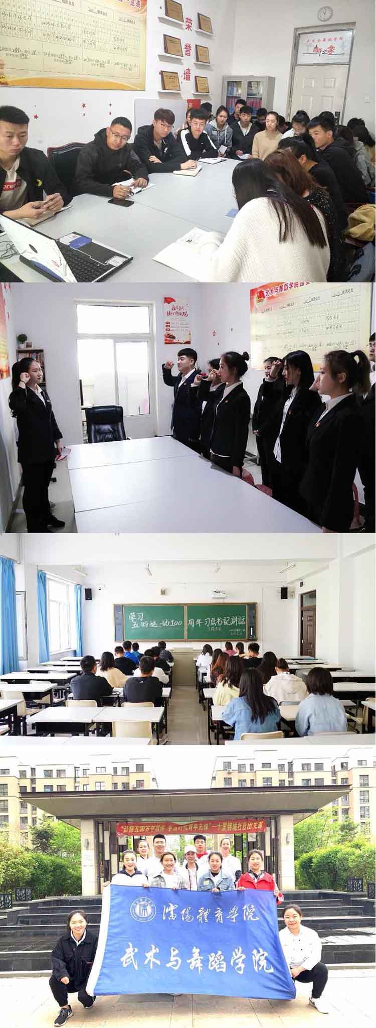 按上级团组织相关要求,武术与舞蹈学院团委于4月30日上午组织在校学生集中收看纪念五四运动100周年大会直播,并于会后掀起了学习宣传贯彻大会精神和习近平总书记重要讲话的热潮;5月2日各支部召开主题团会,以学习习近平总书记在纪念五四运动100周年大会上的讲话为主题,同学们相互交流学习心得,纷纷发表感言,表示将牢记嘱托,全面贯彻落实新时代中国青年的具体要求,争当有远大理想抱负、有深厚家国情怀、勇于担当、砥砺奋进的新时代青年;5月4日中午,根据团章中发展团员的要求,举行新团员入团仪式,全体团员佩戴团徽,面向团期庄重宣誓;5月5日上午,组织在校部门学生前往十里锦城社区开展志愿服务活动,与社区青年一同重温入团誓词,同唱团歌,用青年人的方式共同欢度青年人的节日。