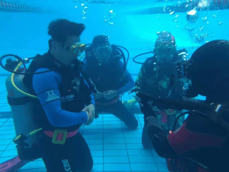 大联潜水有限公司宋阳是社会体育学院外聘教师。他对潜水运动的发展和种类等基本知识作了简单介绍。大联潜水专业教练和游泳党支部教师及学生党支部的潜水实习生对参加体验的20余名体验教师在装备使用、水下技巧及注意事项等方面进行了详细的指导服务,强调了水下安全问题。
