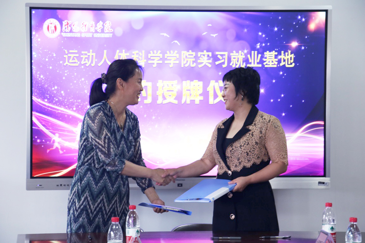 运动人体科学学院院长衣雪洁(左)与企业代表签约合影