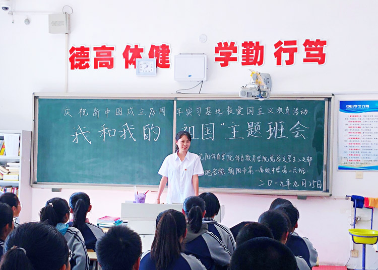 9月25—27日,体育教育学院党总支学生第二党支部党员实习教师在实习基地校开展庆祝新中国成立70周年“我和我的祖国”主题爱国主义教育活动,支部31名学生党员根据活动要求在所在15所实习基地通过主题班会、党史国史民族史国史宣讲以及小型音乐会等形式开展活动。