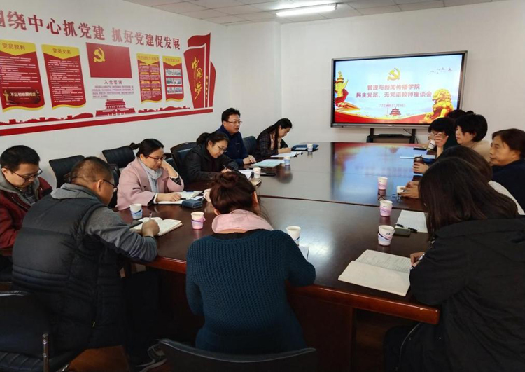 11月6日下午,管理与新闻传播学院党总支在党员活动室召开民主党派、无党派教师座谈会,听取各民主党派、无党派教师代表对学院建设和发展工作的意见、建议。学院民主党派、无党派教师全员参加了会议,学院班子成员及部分总支委员出席了会议。会议由党总支书记张建波主持。