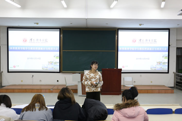 为了加强学生实践能力培养,检验实习成果,体育教育学院在2016级实习过程中开展了实习生优秀课评比活动,通过基地推荐、二级学院评审,最终评出一、二、三等奖。为了让同学们更好的掌握课的设计、实施等环节的综合技能,12月19日,体育教育学院分两个会场组织优秀课一等奖同学进行模拟授课展示。