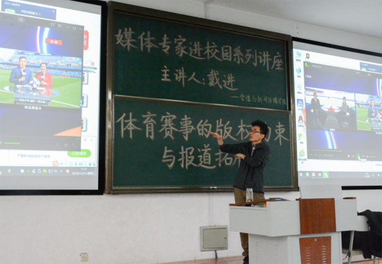 学生新闻专业综合素质提升,12月25日,管理与新闻传播学院举办了媒体专家进校园系列讲座活动,邀请了中央电视台制片人、主任编辑戴进开展以《体育赛事的版权约束与报道拓展》为主题的讲座,新闻学专业和网络与新媒体专业部分老师和全体学生共同参加讲座。