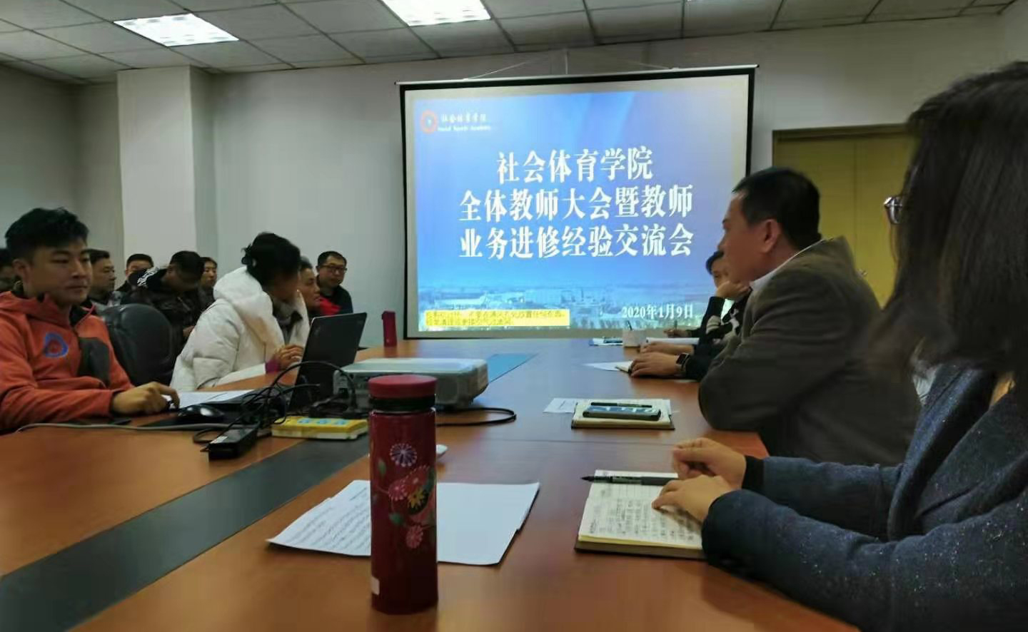 1月9日,社会体育学院在游泳馆会议室召开全体教师大会暨教师业务进修经验交流会,社会体育学院领导班子和全体教师参会,会议由院长冯欣欣主持。