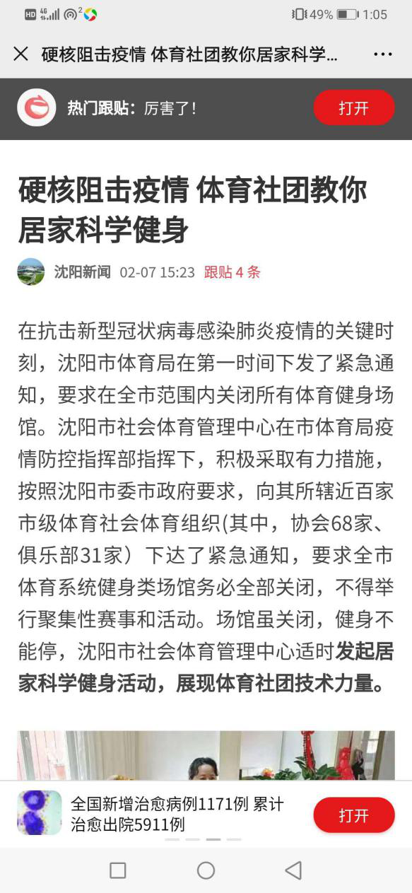 疫情防控期间,体育教育学院师生积极响应沈阳市体育局“闭馆健身不停”的号召,利用专业优势指导大众居家健身,不断贡献体教人力量。2月7日网易沈阳新闻栏目以“硬核阻击疫情,体育社团教你居家科学健身”为题进行了报道,获得社会各界广泛好评。田径教研室主任、沈阳市田径协会会长林松、教师李玲,通过沈阳市田径协会官方抖音、微信群等网络平台制作和发布居家室内训练课程视频4期。体操教研室主任、沈阳市跳绳协会会长门传胜,带领体育教育学院罗皓阳等10名学生,通过抖音、快手、微信等自媒体平台,利用跳绳作为辅助器械,结合体操、健美操、瑜伽等进行综合练习,制作并发布居家健身操10套,其中《奉天小虎队——皓小虎》抖音获得点赞量达到7.4万。