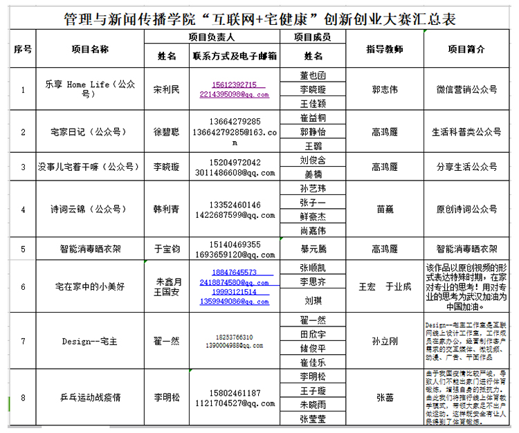 “互联网+宅健康”创新创业大赛项目汇总表