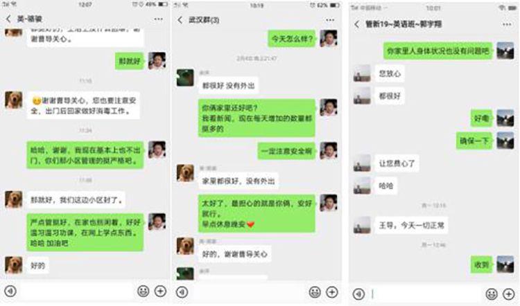 辅导员通过电话、微信等方式引导学生客观认识新型冠状病毒的相关常识,用爱心争做贴心人,特别是针对湖北籍的学生、孤儿、贫困学生等群体给予更多的关心关爱和心理疏导。