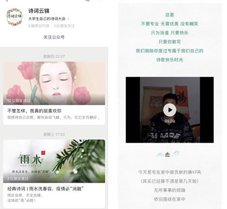 2018级学生制作公众号“诗词云锦”,并刊发为武汉加油相关诗词