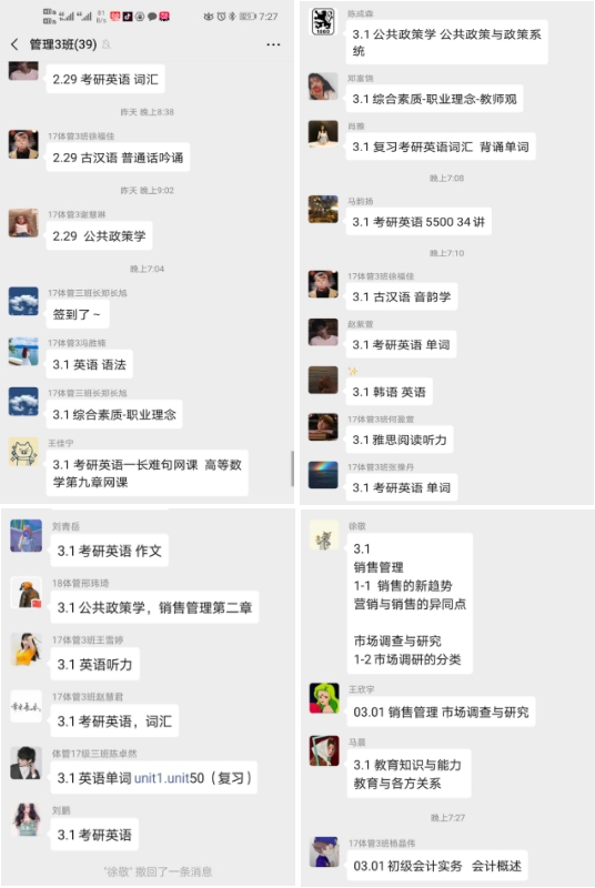 学生每天通过微信向本科生班导师和班级微信群打卡,报告学习情况,也可以在群中就某一专题进行线上交流研讨。微信打卡活动受到了班级同学的一致好评,激发了同学们的学习热情,现在每天的学习打卡成为班级同学们的必修课。真正做到了“微信打卡不停学,学习成长不延期”。