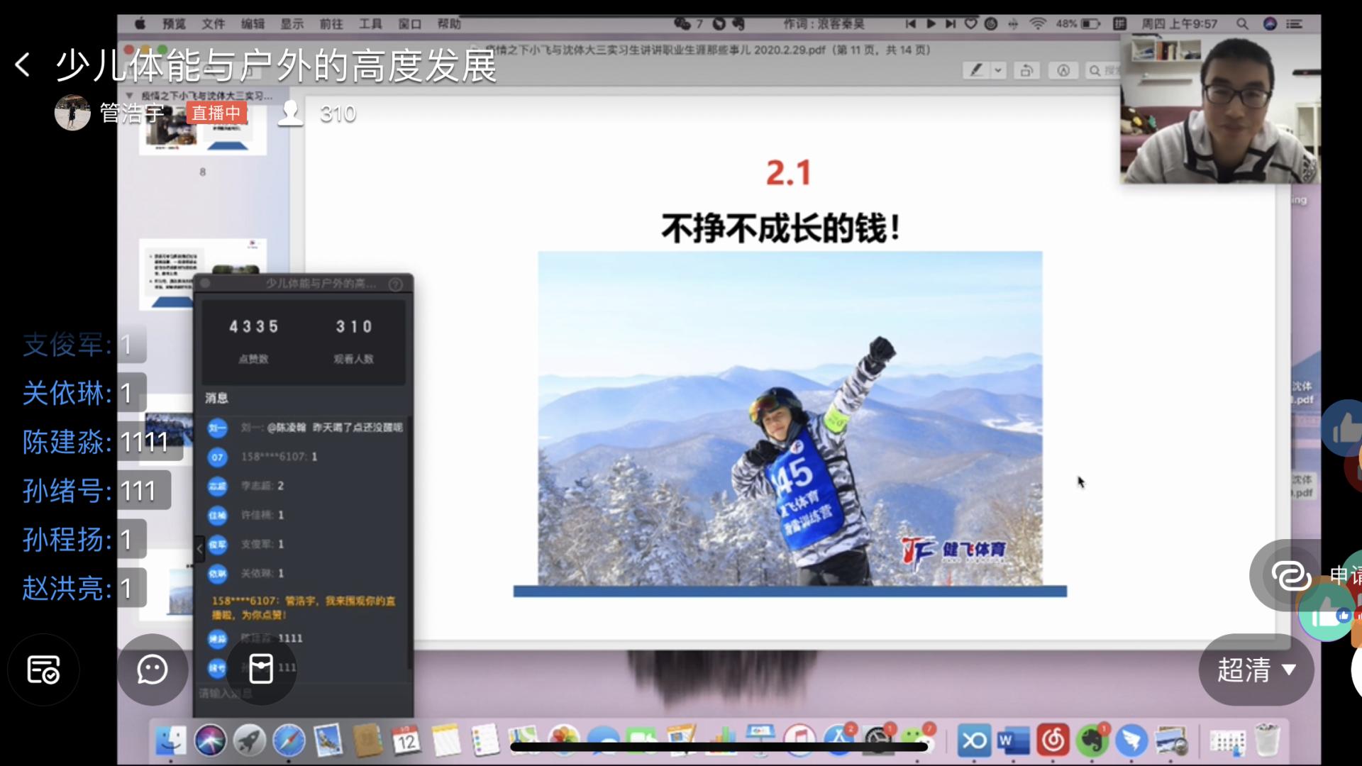 3月12日,社会体育学院2017级举办实习生“职业生涯规划”实习培训,由北京健飞体育创始人张建飞主讲。本次讲座仍然采用云培训的方式,在钉钉上以群直播的方式开展。