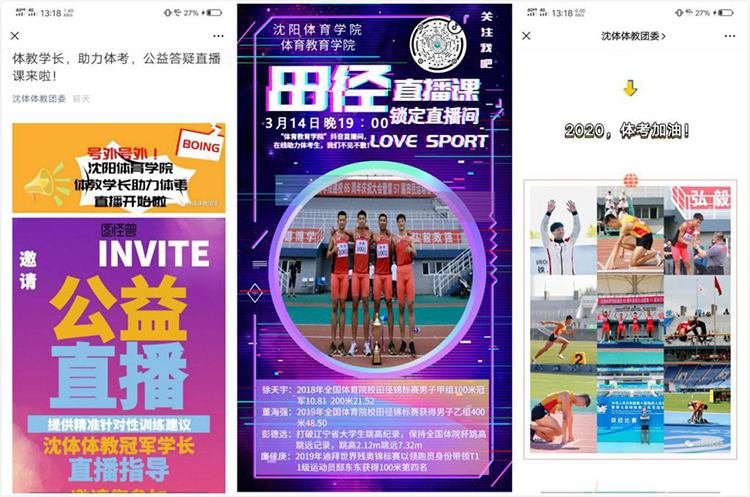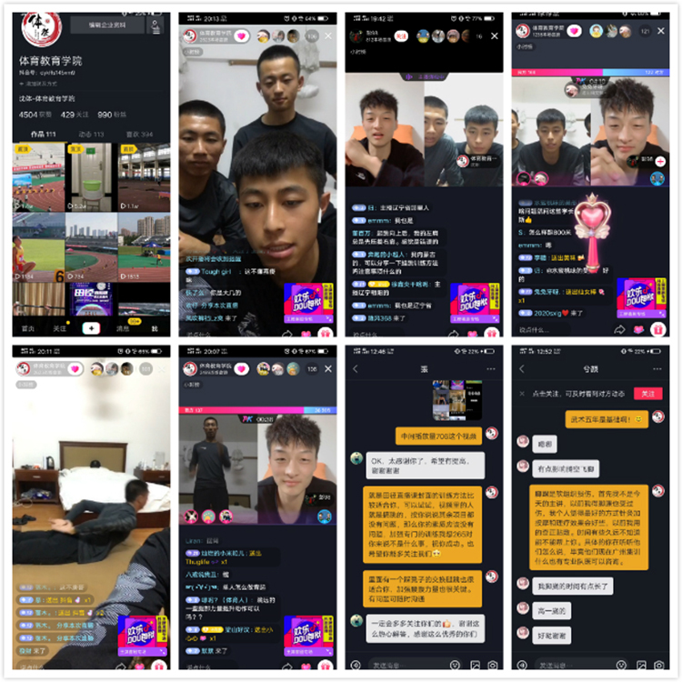 学生成立了“平台策划小分队”,他们需要花几天的时间进行拍摄和后期剪辑,再上传到抖音和微信平台,供在家训练的体育考生们收看学习,并在线指导考生们解决训练时遇到的问题和困扰。直播中,体教学生志愿者“主播”们在技术动作要领和训练技巧等方面进行了讲解和示范,代表学院全体同学向一线的医护人员表示慰问,并表示可专门为医护人员子女提供一对一线上训练指导帮扶。
