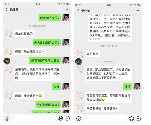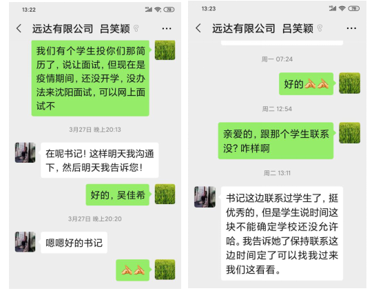 主动联系用人单位,积极为学生搭建与企事业单位之间的桥梁。3月27日,学院党总支副书记高鸿雁和辅导员主动与沈阳远达有限公司联系,了解该公司的用人需求后,积极推荐优秀毕业生,并促成了该公司与学生在3月31日进行网上面试。经过网上面试,该公司对看球吧