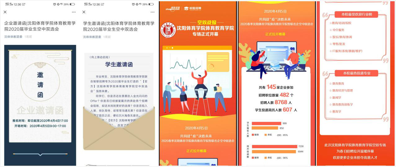 为组织好本次双选会,体育教育学院从线上宣传、联系企业、资质审核、指导学生参加等方面做了大量准备工作,耐心细致科学的做好学生思想引导工作,分类施策,精准帮扶,希望最大限度减轻疫情对毕业生就业工作的影响,为实现毕业生更加充分和更高质量就业提供帮助。本次空中双选会共有省内外145家用人单位参加,提供就业岗位8768个,岗位总体供需比例约为1:8.7。招聘会共有999人报名,体育教育专业报名386人。招聘会当天每小时通报1次企业和毕业生参会情况,截至5日17时,共有669人参加,上线率达到67%,其中体育教育专业报名的386名学生全部参加,占体育教育专业毕业生总数的92.1%。招聘会共有607人投递简历,占参加人数的90.7%,投递量达7320份,线上面试次数187次,电话面试468人次。