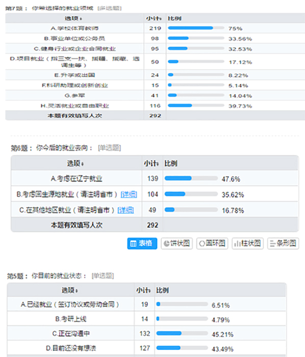 通过本次调研,进一步明晰了学生和家长对就业工作的认识和需求,同时也将目前的就业形式和10种就业方式进行了宣讲。下一步运动训练学院将以问题为导向,对学生进行更有针对性的分层、分类、分型指导。力争高质量完成年终、在辽就业率目标。