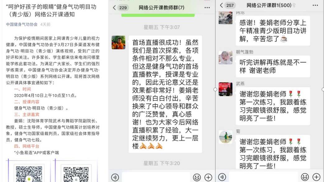 4月10日,受国家体育总局健身气功管理中心选派,武术与舞蹈学院姜娟教授做全国健身气功首次网络公开课讲座,内容为健身气功•明目功(青少版)。此次讲座得到国家体育总局健身气功中心领导的高度认可,受到广大健身气功爱好者的广泛赞誉,同时,也体现了看球吧 教师发挥自身优势积极服务国家、服务社会的责任和担当。 姜娟教授讲授网络公开课 课后交流 新闻作者:武术与舞蹈学院 孙来爽 责任编辑:江志强 新闻日期:2020-04-17 点击:次