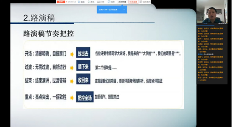 赵乐发围绕“认识创新创业大赛、赛前准备、现场展示”三个方面,为大家系统介绍了非体类竞赛种类,详细讲解了项目选择、团队组建、创业计划书撰写等内容,他还对项目路演的相关技巧展开分析,全面展现了竞赛过程的全貌。培训过程深入浅出,在线师生反响热烈,在讨论区踊跃交流并提出问题,赵老师一一耐心解答。