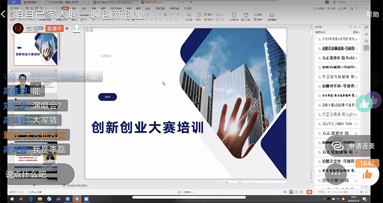 对73个项目的208个成员进行了“聊聊三创赛和互联网+大赛那些事儿”线上培训活动,办公室主任李磊老师重点围绕选题、论证、实施等方面问题进行讲解。