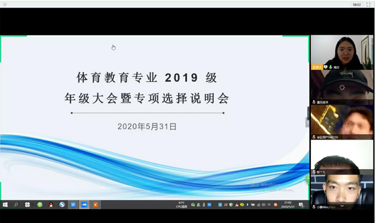 人才培养方案中体育教育专业学生大二开设专项理论与实践课程的有关安排,帮助和指导2019级学生做好专项选择,5月31日晚,体育教育学院2019级运用线上会议平台召开年级大会暨专项选择说明会,共计404名学生及家长参与了此次会议。会议由辅导员高飞主持。