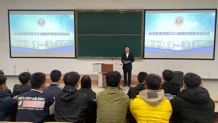 教学信息交流和管理工作,进一步加强教学质量监控,有效提升教学效果,11月3日,体育教育学院召开2023级学生教学信息员培训会,培训会由主管本科教学副院长鞠秀奎主讲,14名教学信息员参与培训。
