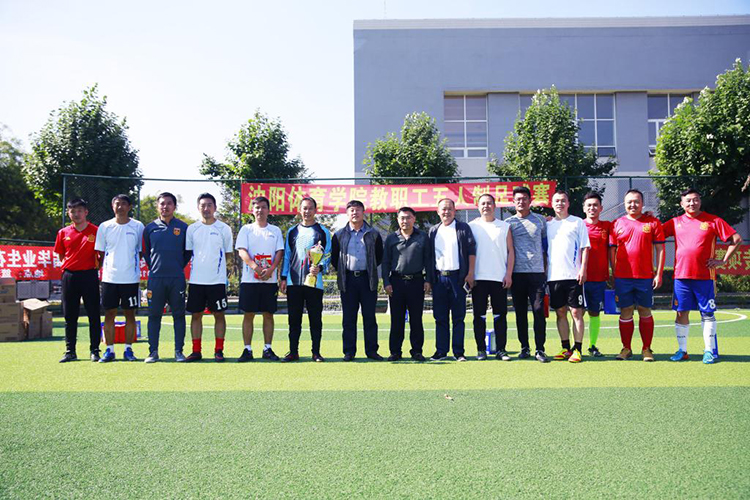 赛后工会、运动训练学院、足球协会、社会体育学院相关负责人与部分球员合影