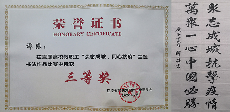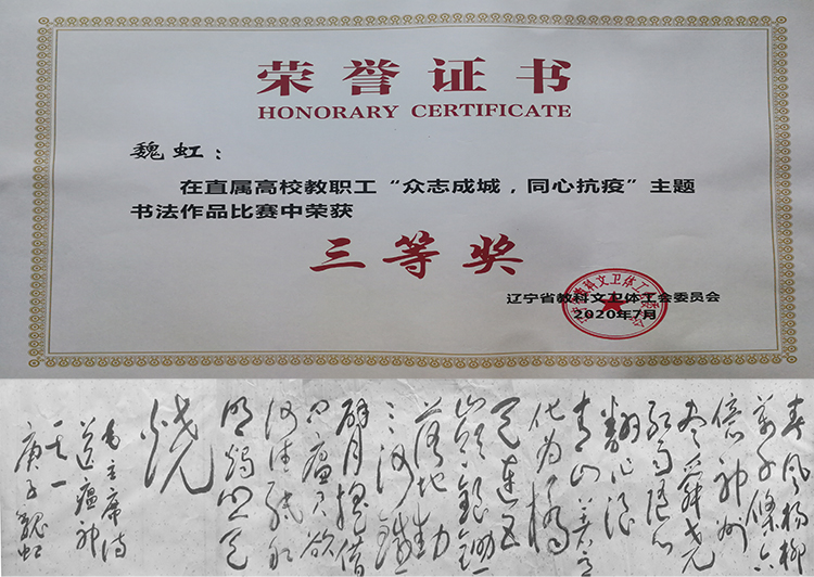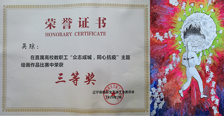 近日,由辽宁省教科文卫体工会组织的以“众志成城,同心抗疫”为主题的教职工书法、绘画、 摄影作品网络征集活动已圆满结束。我校广大教职工踊跃参与,用笔墨抒发感怀,用丹青描绘英雄,用镜头记录瞬间,充分展现了我校教职工团结一心、共抗疫情的精神风貌。经省教科文卫体工会组织专家评选,共选出书法、绘画、摄影作品一、二、三等奖共360 件。其中,我校周锐获摄影作品二等奖;魏虹、谭淼获书法作品三等奖;吴琼获绘画作品三等奖。 新闻作者:工会 李亚轩 责任编辑:才丽娜 新闻日期:2020-07-20 点击:次