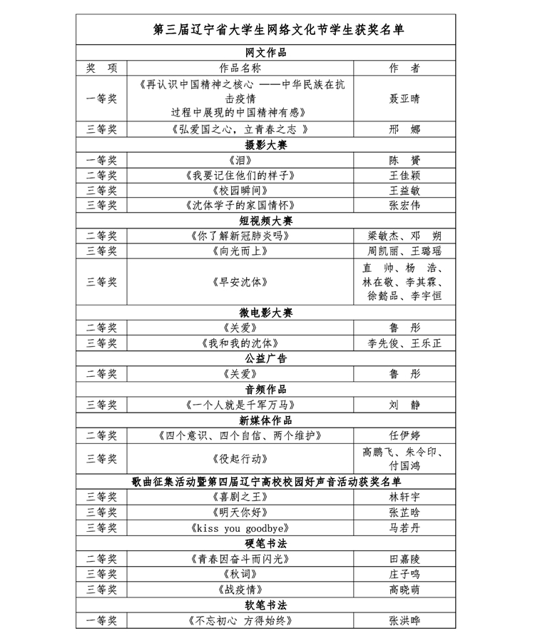 近日,辽宁省委宣传部、省委网信办、省委教育工委、省教育厅2020年联合举办的第三届辽宁省大学生网络文化节和全省高校网络教育优秀作品推选展示活动评选结果揭晓。本次活动中,我校共35项作品获奖,其中一等奖5项,二等奖6项,三等奖15项,优秀奖9项,看球吧
