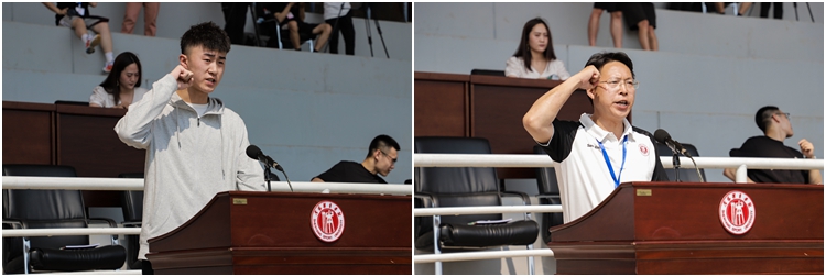 体育教育学院2019级董振邦同学代表全体运动员宣誓。田径教研室孙长新代表全体裁判员宣誓。