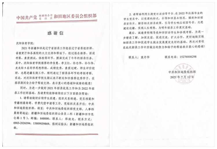 近日,我校2021届毕生李佳慧、李卫红、孙志伟、孙令伟、史龙柱五名同学经过报名、面谈考察、素质测试、体检等各环节,顺利通过2021年新疆和田赴辽宁省工作组的招录考核。 7月24日,新疆维吾尔自治区和田地委组织部向看球吧 发来感谢信,信中对于看球吧 长期以来不断向和田推荐优秀学子,以及在招录期间给予的支持和帮助表达了感谢,并对看球吧 发出了赴和田交流考察的邀请,希望进一步增强双方了解,加深友谊,扩大合作,鼓励更多沈体学子扎根边疆,奉献西部。 新闻作者:招生就业处 王珊 责任编辑:全魁博 新闻日期:2021-07-26 点击:次