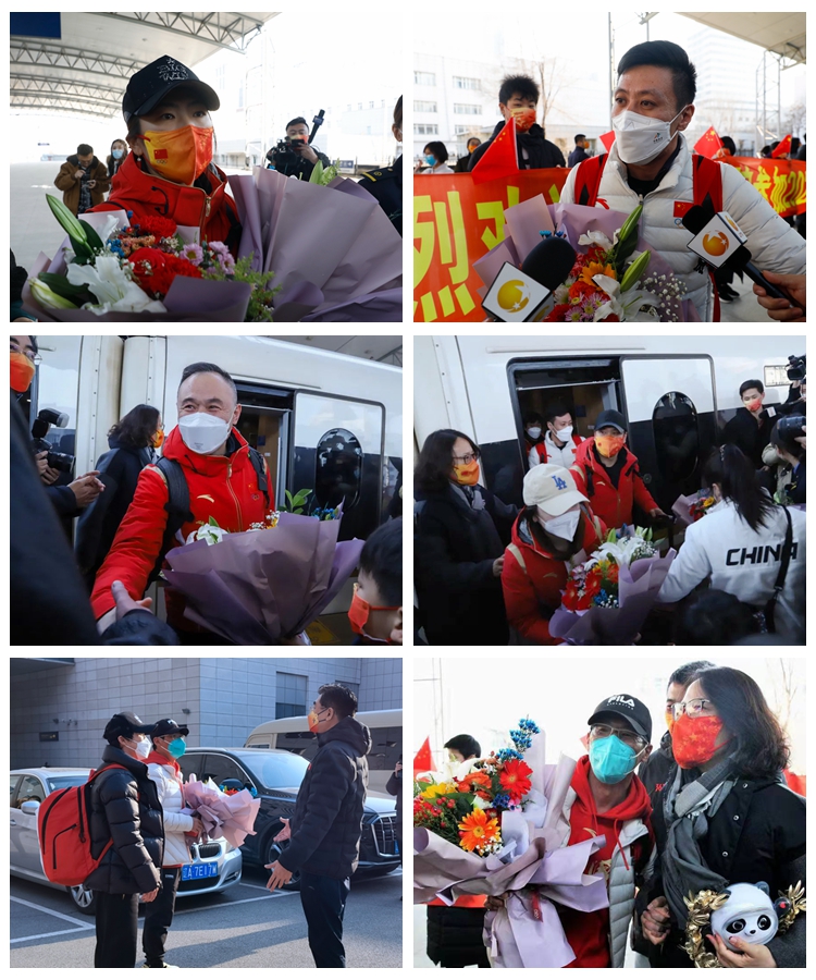 领导、省体育局领导在迎接队伍中一一与运动员、教练员握手,合影留念,媒体争相采访报道,场面热烈温馨,欢迎冬奥健儿回家!