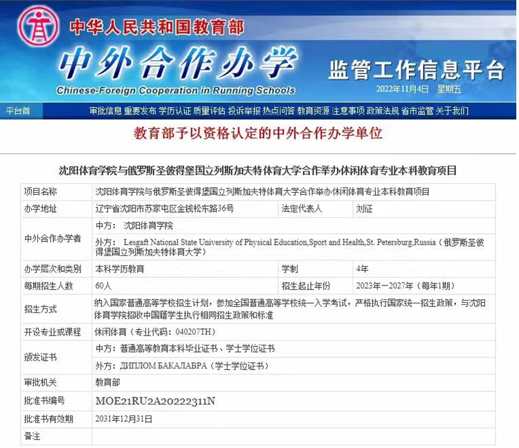 与俄罗斯圣彼得堡国立列斯加夫特体育大学合作举办的休闲体育专业本科教育项目成功获批。这是我校首次申办并获批的中外合作办学项目,实现了看球吧